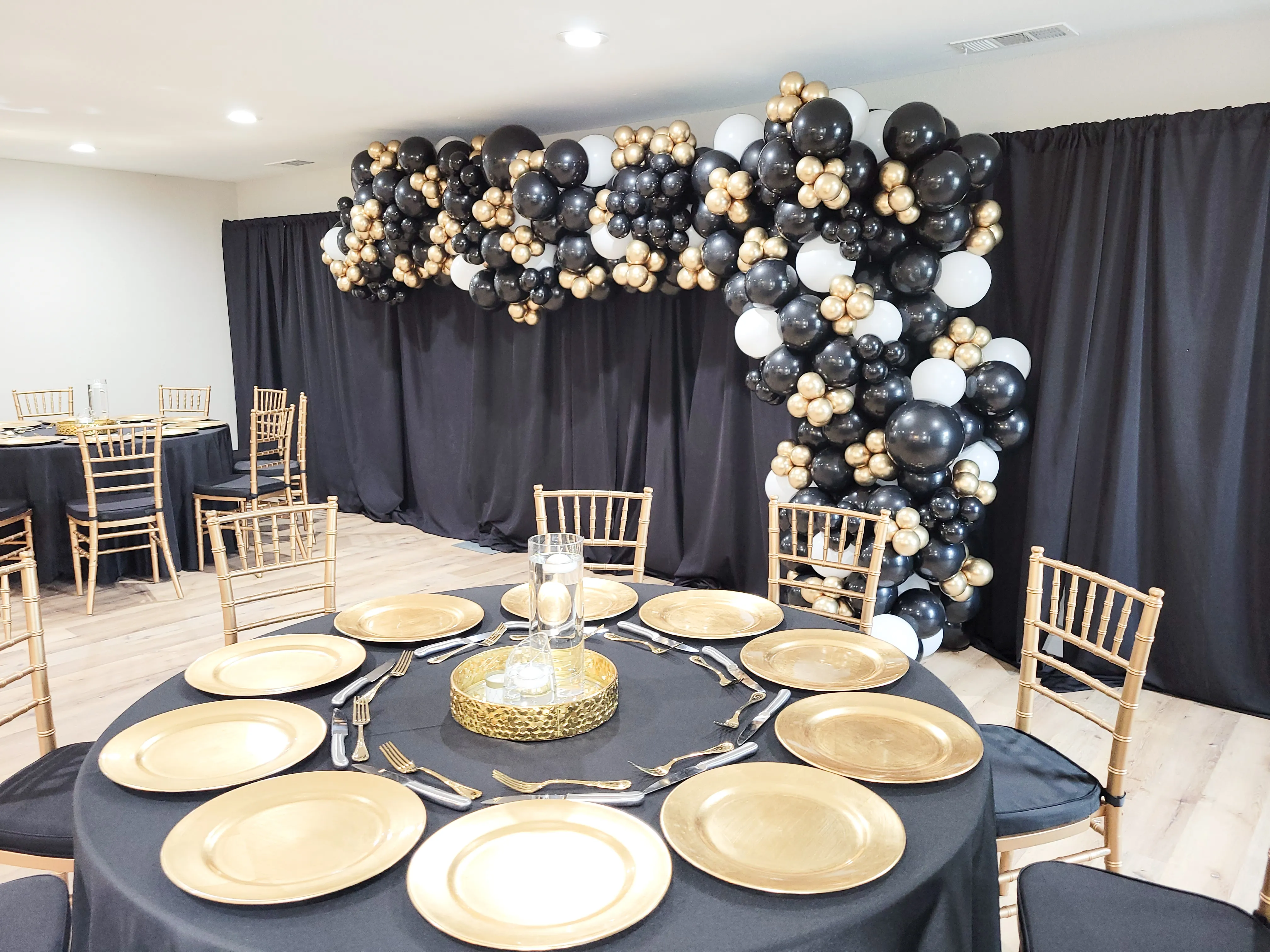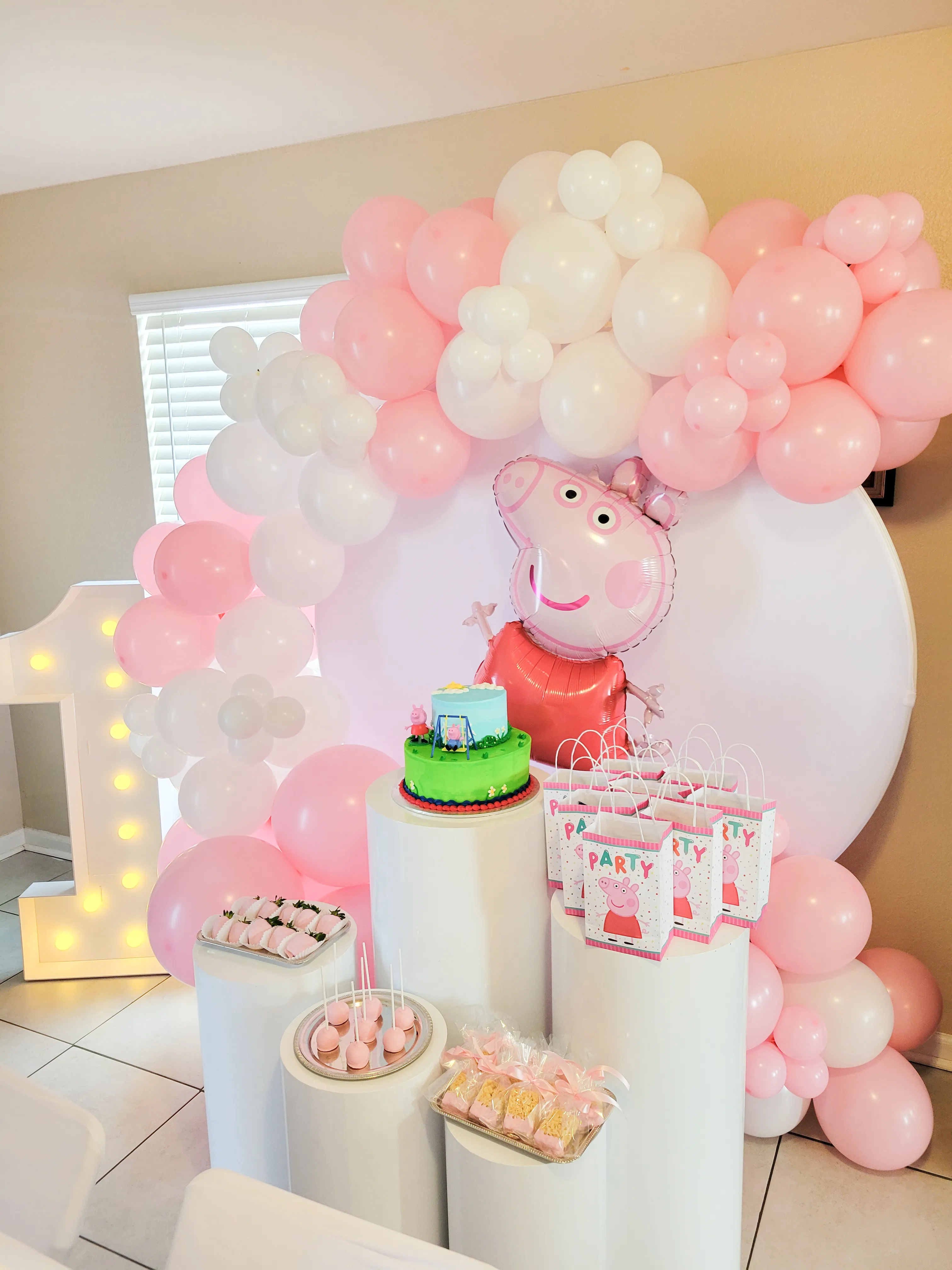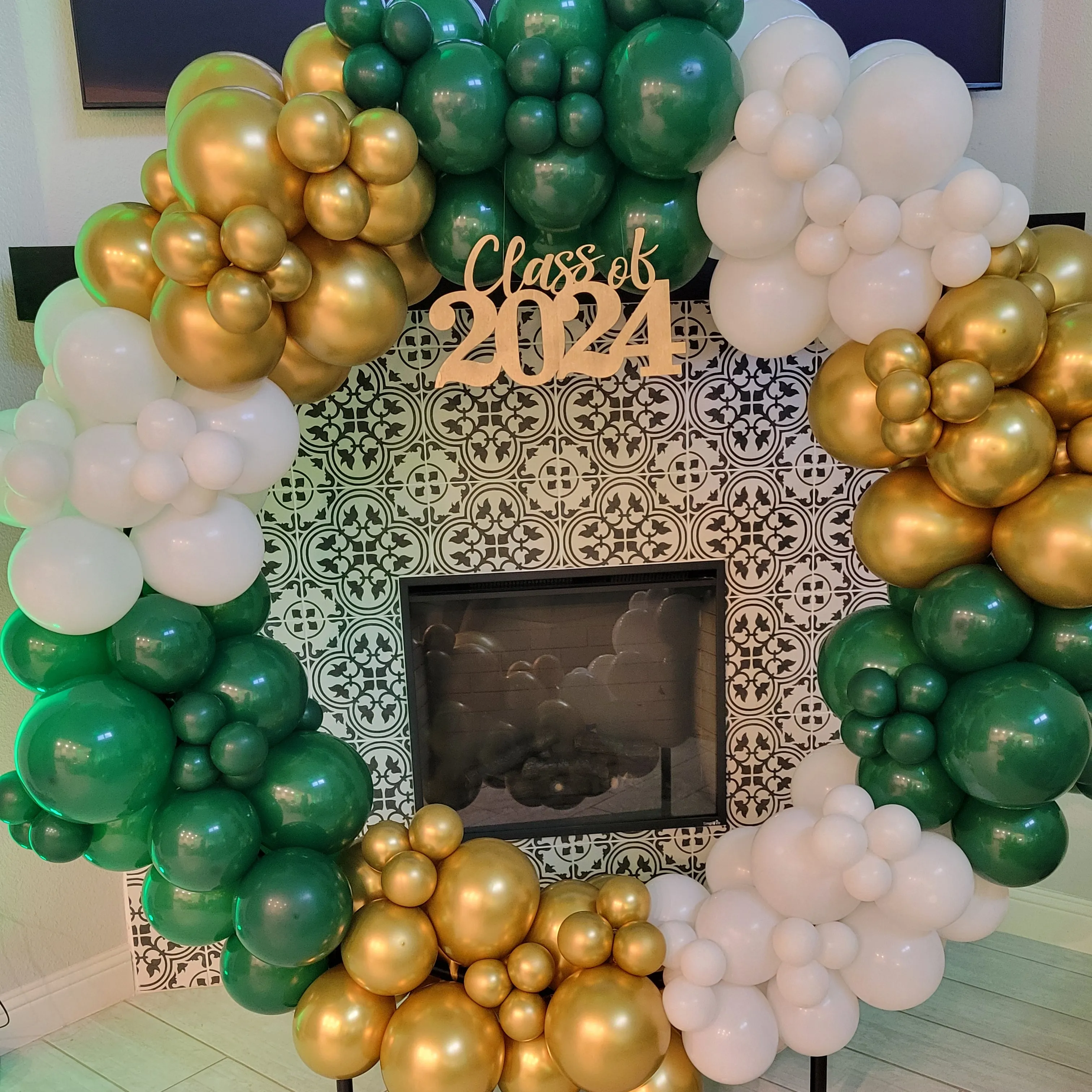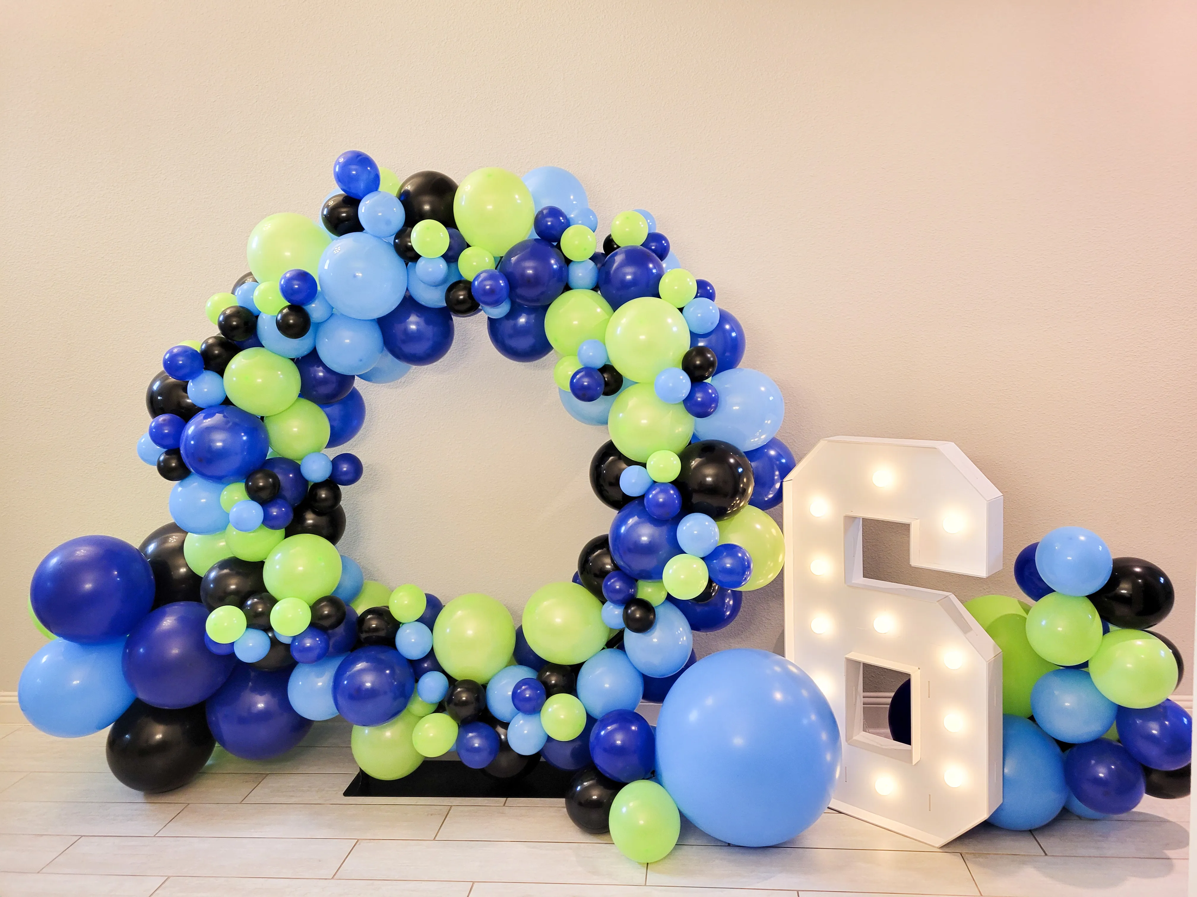 Round backdrop with balloons and number marquee
